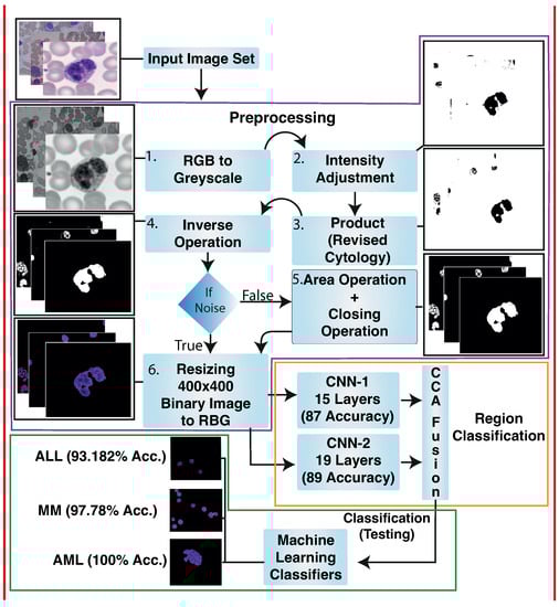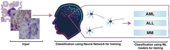 Machine Learning-based networks [,] have been used extensively to extract valuable patterns for prediction tasks in several fields [], including medical diagnostics systems. Death rates can be lessened if the disease is diagnosed earlier and treated in the meantime. It creates a desperate situation, and it consumes much time to detect the disease manually by the hematologist. The detection of leukaemia through computer-aided techniques is very effective, time-efficient, and accurate in overcoming these problems []. Still, there are multiple problems, barriers, and research gaps in the computer-aided system, such as the accuracy of leukaemia cancer and its types (Acute Myelogenous Leukaemia, Acute Lymphoblastic Leukaemia, and Multiple Myeloma), and further their segmentation, and classification. In this research, we focus on detecting leukemia and further identifying its subtype [].