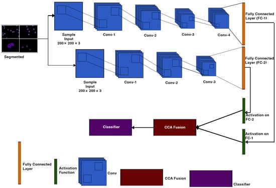 Feature fusion is the process of combining two feature vectors to create a single feature vector that is more discriminative than one of the input feature vectors []. There are some methods for integrating CCA. One method is to combine two sets of feature vectors into a single union-vector, and then extract features in a higher-dimensional real vector space. Another approach is to combine two feature vectors with a complex vector and then extract features from the complex vector space. Both feature fusion methods aim to improve prediction performance; the union vector approach is referred to as serial feature fusion. Parallel feature fusion is the name given to the approach based on the complex vector []. In this research, we use second method to combine the complex feature vectors CCN-1 and CNN-2.