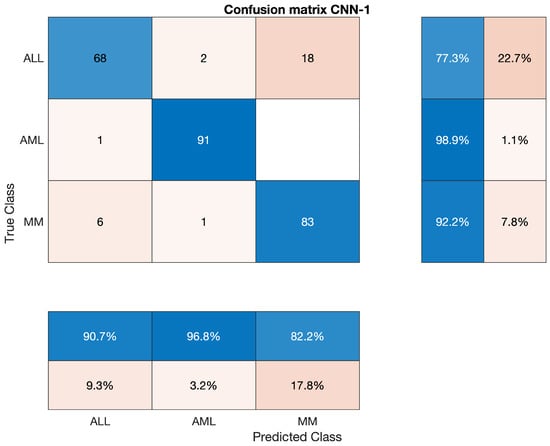 Overall accuracy achieved by CNN-1 on ALL, AML and MM was 89.63%. The overall statistics of CNN-1 are given below in Table 7.