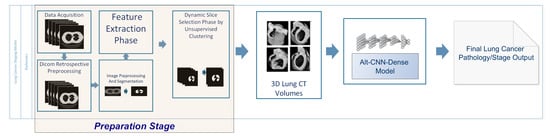 In order to reduce the computation power required for processing 3D volumes and enhance the effectiveness of the proposed CNN model, a semi-supervised slice selection procedure is suggested. The selection procedure assists in constructing informative and concise 3D volumes. The created 3D volumes are input to the new ALT-CNN-DENSE Model architecture. The model outputs the corresponding class. Figure 2 depicts the flow of the decision process through the different computational pipeline phases. A detailed description of each phase is provided.