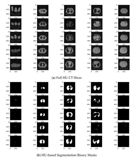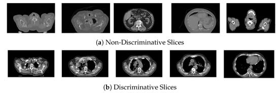 CT scan volumes can be of large number of slices, which leads to high computation time and complexity. Aside from the high computation complexity, another critical issue is the information content of the slices. CT volumes comprise slices of the whole thoracic cavity area. It includes discriminative and non-discriminative lung slices. Figure 4 shows sample slices, exemplar slices in Figure 4a is of low value to the current study as it will not give any additional information to the learning model. In fact, these slices may add noise degrading the performance of the classification model. On the contrary, the exemplar slices in Figure 4b are the ones that need to be selected as they show lung tissue clearly. Another issue is that the exact location (index) of informative slices varies individually per patient, which means that manual selection would be time consuming. Also, static predefined range for the targeted slices will hinder the learning process as the range of informative slices varies considerably. Hence, the slice selection is required to input informative slices to the classifications’ models. The slices are not labelled as discriminative and non-discriminative lung slices; hence, unsupervised clustering is used to group the slices based on a set of extracted features. Unsupervised learning provides an adequate solution to the issue of unlabeled slices, as it divides the slices into their natural groupings based on the extracted features.