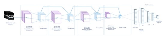 After the selection phase, the slices are constructed into 3D volumes and input to the proposed ALT-CNN-DENSE Net model. The proposed architecture is illustrated in Figure 5, where it depicts the characterizing blocks of alternating convolution and average pooling layers followed by a drop out layer and multiple dense layers. The structure of the network architecture is detailed in Table 2. ALT-CNN-DENSE Net uses 3D kernels for the convolution process on the input CT volumes, which enables the extraction of both spatial and spectral features [34]. Such capability provides an advantage over 1D and 2D CNNs. However, this comes at the cost of increased complexity. Thus, the sequence of blocks of alternating convolution (CONV) and pooling layers are devised for dimensionality reduction and subsequent complexity moderation. Pooling eliminates redundant and irrelevant information reducing overfitting. Also, it provides spatial translation invariance [35]. In addition to the known advantages of pooling, the downsampling generates bird’s eye view feature maps for the following CONV layers. The generated feature maps aid the early detection of 3D primitives reducing the CNN depth. The CONV layers comprise different filter sizes to extract the multiscale inter-slices granule details in each volumetric input. The architecture has inherited the residual connectivity from RESNET. Average pooling layers as well as global average layer was taken from InceptionV3. Residual connections allow gradients to flow through a network directly, without passing through activation functions. At this point, the convolved features are passed between layers with the residual. This has the advantage to compensate any loss in the features between extensive mathematical calculations of layers as well as preserve spatial and temporal features in slices at the same time. Average pooling is used instead of Max pooling to guarantee that pixels with their surroundings relations are taken into consideration and not ignored. Average pooling maintains inter and intra-slices locality spatiotemporal information, unlike in Max Pooling where specific features are selected despite of location. The position of the tumor is critical for lung tumor phenotyping and cancer staging, which explains why average pooling gives higher performance with the problem considered here.