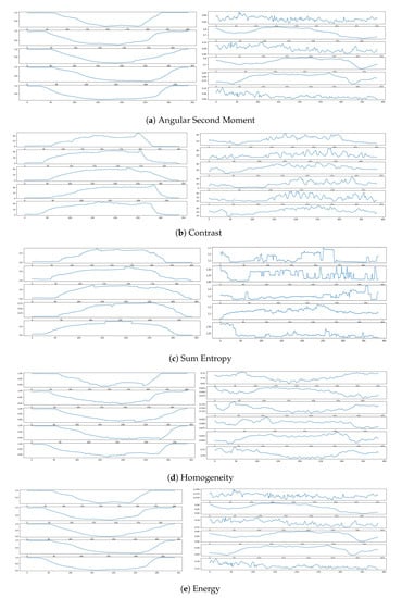 Haralick Textural Features extracted from lung tissue binary mask slices (left) and from full HU band CT slices (right).