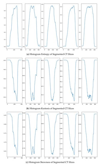 For each slice S, , C, , H, E, , and features are extracted from the full HU CT slices and their corresponding binary masks . In Figure 7, Haralick features values variation across slices of five patients are depicted. The diagrams elucidate that the features generated from the binary masks between peripheral slices and middle slices better differentiate discriminative vs non-discriminative features. For instance, takes a value of one for constant images denoting non-discriminative lung slices. Similarly, contrast feature C has a constant value of zero for all peripheral non-informative lung slices, while it varies with the middle informative lung slices. Histogram based features depict the same pattern, which is clear when comparing Figure 8 and Figure 9. Thus, the features extracted from the binary masks are the ones selected to be input to the clustering algorithm.