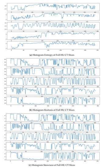 For Histogram-based features, three descriptive statistical measures are computed for each histogram. Histogram Entropy () measuring the uncertainty and disagreement of the distribution is calculated according to the equation shown below. Kurtosis () and Skewness () measures are calculated. Kurtosis () detect whether the data are heavy-tailed or light-tailed relative to a normal distribution. Skewness () checks the lack of symmetry. The measures are evaluated given the following equations, where N is the number if bins, w is the bin width, is the bin probability and is the bin count.