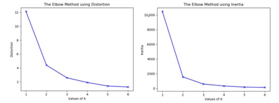 Elbow Method results using Distortion (on the left) and Inertia (on the right).