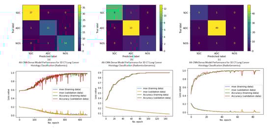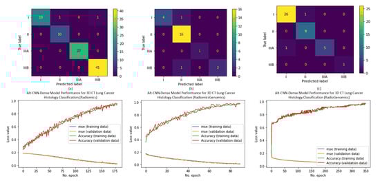In Figure 14, the sample confusion matrices elucidate the ability of ALT-CNN-DENSE Net to discriminate minority classes. It is particularly evident with Stage IIIB in Radiogenomics and Radiomics-Genomics datasets, where the number of training and testing samples is challenging. This proves that the ALT-CNN-DENSE Net can handle imbalanced data with highly skewed distributions. The learning curves exhibit a similar pattern to phenotyping curves.