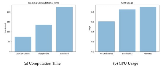 Other performance aspects that are noted are the model building and training time together with the GPU usage. Figure 13 shows the enhanced performance of ALT-CNN-DENSE Net given both performance aspects. The improvement can be attributed to the reduced architecture depth resulting from the successive early pooling layers combined with the residuals connections.