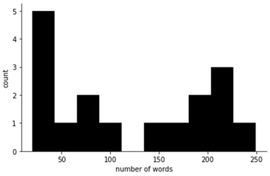 In terms of text lengths, the proposals were roughly divided into two groups with relatively shorter and longer samples. The average word count in a proposal was 121, with a considerably large standard deviation of 83. Figure 1 provides a histogram of the word counts. This histogram highlights a bi-modal distribution, corresponding to nine shorter and eight longer texts. The average number of words in the eight longer proposals was 200, with a standard deviation of 35. This group of eight proposals was selected as the evaluation set and was used in the human evaluation, details of which are described in Section 2.3.
