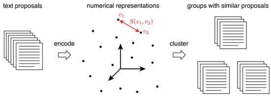 Specifically, the proposed method consists of two steps. First, each text proposal is encoded into a numerical representation that captures the core semantics and context of the text. For this encoding step, we consider two NLP algorithms: a basic measure based on the frequencies of words [] and a deep-learning-based contextual embedding scheme pretrained on large corpora [,]. Second, these numerical representations of the proposals are used to cluster closely related proposals [].