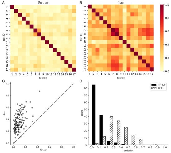 USE was more informative than TF-IDF for comparing text proposals. As shown in Figure 3D, the histogram of was skewed toward zero, with a median of 0.08, indicating that most of the values were near zero, as highlighted by the small off-diagonal values present in Figure 3A. In contrast, the histogram of was more symmetrical (Figure 3D), with a median of 0.35, close to its mean (0.36). Thus, this wider range of allows one to distinguish semantically different texts from others.