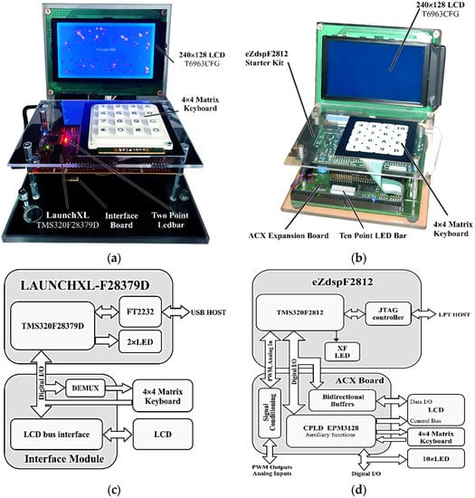 The TMSLAB module was designed mainly to implement discrete-time-control methods and mathematical models of dynamic objects. It was developed in two versions. Both implementations are used to perform control of a real object or to realize a discrete-time simulation of closed-loop-control systems, with the use of the TMS320C2000 MCU family. The TMSLAB in its second version (Figure 2a) is based on the TMS320F28379D MCU, which is a very advanced modern unit, with two CPUs and two CLAs (Control Law Accelerators—auxiliary control coprocessors). The first implementation of the TMSLAB was based on the TMS320F2812 (Figure 2b), which was designed for industrial-control applications but is obsolete these days. Both of the didactical modules were based on development boards: LaunchXL-F28379D and the eZdspF2812 Starter Kit. For each of them, a dedicated extension board was designed—an Interface Module for TMSLAB v.2 (Figure 2c) and an ACX Board for TMSLAB v.1 (Figure 2d). Both extensions allow to connect a matrix keyboard and an LCD as parts of the user-interface panel.