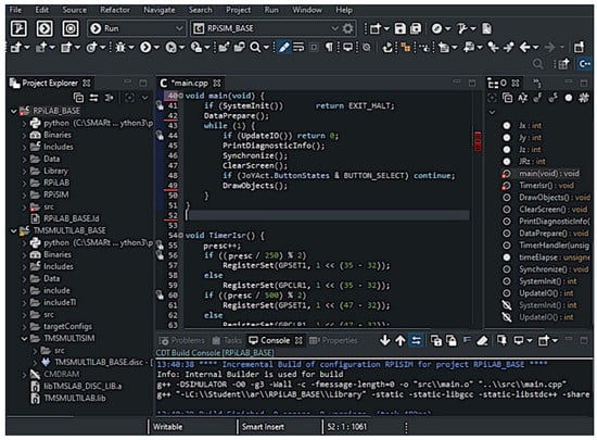 To form a common-programming platform for the RPILAB module and both of the virtual simulators, an Eclipse CDT was set with two different toolchains. The first one was for the real module with cross compilation to ARMv7-M architecture, and the second one was for virtual simulators with native compilation on an Intel x86 platform based on the MINGW project. A prepared IDE (Figure 4) was used to seamlessly develop software for all three platforms (real RPILAB and the two virtual simulators) with toolchain settings written in the Eclipse-configuration file.