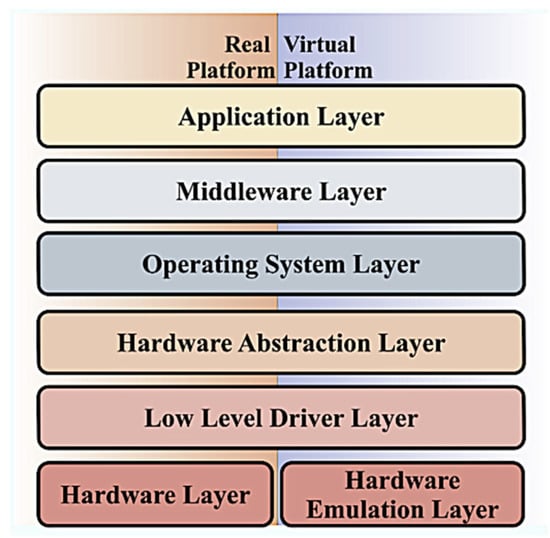 There are many concepts of software development. They can consider different aspects of hardware platforms, operating systems, or specific frameworks. For embedded systems, few dedicated operating systems [47] and frameworks were designed [48]. Most of them use a typical software-layer architecture [1], which is shown in Figure 6. According to it, a prepared embedded application can run successfully on real or precisely emulated hardware platform without any additional efforts. For embedded-system-software development, those layers often overlap or omit each other to gain access to the critical hardware components or other layer resources.