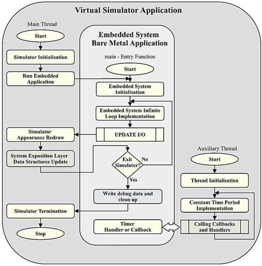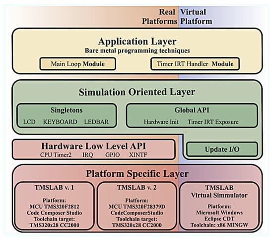 An important part of the development of the tools to support the design of embedded systems are the various types of simulation tools, virtual platforms, and virtual labs [15,16,17,18]. Virtual platforms of embedded systems are the key to software’s modern and rapid development process [19,20,21]. The programming process, using those platforms, can start in the early-project stage, in parallel to hardware development [22], so in the very early stage of an embedded project. There are many solutions in the field of virtual platforms [23]. They can be oriented on precise system emulation [24,25] or try to imitate the system behavior of embedded systems through their simulation [26]. Virtual simulators can imitate a whole system [27,28] or can reproduce behavior at the hardware level [29]. A mixed approach is also common [30], to prepare an efficient virtual environment for embedded-system programming [18].