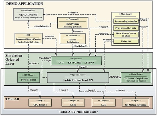 There is no commercial emulator or virtual simulator of the TMSLAB didactical module. This is obvious, since the TMSLAB is a custom microprocessor system. Such a simulator would be an incredibly complex piece of software, so its production time and costs would be incomparably higher than the TMSLAB module itself. Alternatively, a virtual simulator of TMSLAB can also be very simple and rapid in development, if it simulates only limited functionality—the most important in the programming process. Based on this assumption, the TMSLAB simulator should deliver only the components needed for front-end programming using Bare-Metal techniques [42]. Properly designed back-end algorithms can easily reach multiplatform capability, so they do not need any special simulation mechanism.