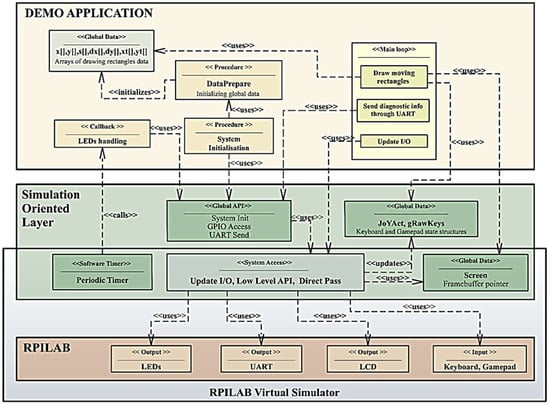 In a similar way as for TMSLAB, the RPILAB virtual simulator was developed for the Microsoft Windows platform. It imitates the basic behavior of Video Framebuffer, Keyboard, Gamepad, UART, and two LEDs. The functionality is accessible through the global shared data and a dedicated API in the SOL. All those features were used in the Demo Application and are shown in Figure 13.