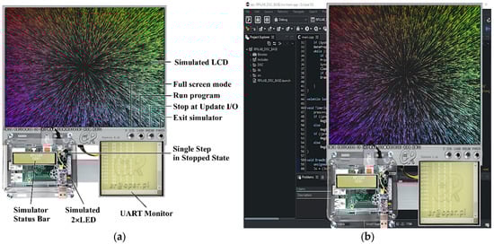 The two developed virtual simulators are running under the Microsoft Windows OS with embedded software compiled for Intel x86 architecture. For this reason, a comparison of performance, memory footprints, or timing relations of both platforms would be unreasonable and unnecessary, bearing in mind the purpose of the presented simulators (progressing development of embedded-application functionality, without access to a real device). The simulators were tested according to the system functionality implemented in the SOL. The sample test results for the TMSLAB module are shown in Figure 15a–d (for memory-visualization-unit tests) and in Figure 15e,f (for functional tests based on the demonstration program shown in Figure 11).