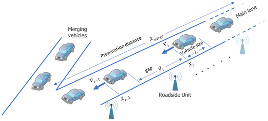 Here, we aim to examine alternative gap profiles to be imposed upon the AVs on the road to improve traffic flow in the intersection. As mentioned above, such profiles may be implemented using vehicular ad hoc networks. An alternative option is to locate short-range road-side units (RSU) [19] along the lane before the merging position to manage the vehicles’ speed and gap profiles (see Figure 1). Such units only require vehicle-to-infrastructure communication. Their locations are well defined (e.g., proper line-of-sight, distances, etc.), and their signal is specific [9]. In contrast to vehicular ad hoc networks, RSUs are trusted, and their computation capabilities are higher than those of the vehicles.