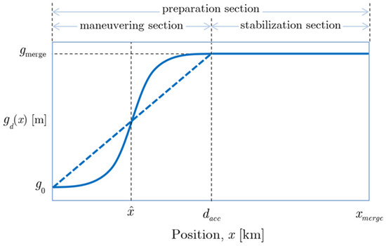A sigmoid profile (solid line in Figure 2): Only a portion of the maneuvering section is effectively used for gapping. At the extreme, this resembles a late merge approach with human driver behavior [16,21]. An error function sigmoid was used to construct the sigmoid gap profile: