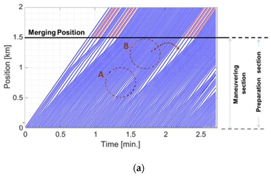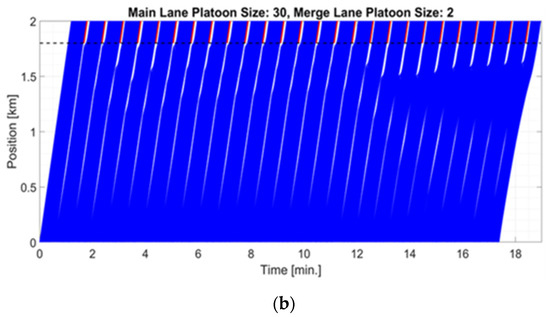 Figure 3 introduces two examples of vehicle dynamics along the road section of the main lane. The positions of the main lane vehicles are presented (with blue lines) as a function of time. Red lines indicate merging vehicles. Figure 3a shows the short-term dynamics (vehicles 1–100 for 3 min) of a case with 10% zipper merging, and Figure 3b shows a longer-term (vehicles 1–800 for 18 min) of a 30:2 platoon size ratio. Note that the vehicles in the preparation section try to comply with the gap profile provided, and accumulated gaps are added up to form platoons with distinguished large gaps between them. This method utilizes fractions of gaps gained during the maneuvering section by contributing them to larger gaps. For example, small gaps marked by circle A in Figure 3a are translated to the larger gap between two dense platoons, leaving vehicles without excessive gaps in B. This optimizes the potential for a larger number of vehicles to merge in each gap and avoids situations where a fraction of gaps is “wasted” without merging vehicles.