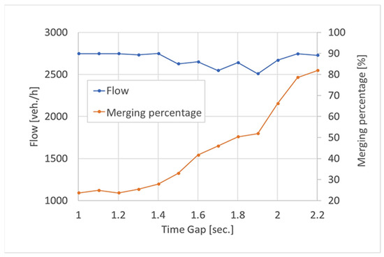 Figure 4 shows the effect of inlet density (Tg(x = 0)) on the merging success and traffic flow (for an example case with xmerge = 1.5 km, %dstb = 5% and vgapping = 90 km/h). In the graph, the x-axis corresponds to inlet density (with Tg(x = 0) between 1–2.2 s). From the graph, it is clear that, for high inlet densities (with Tg(x = 0) = 1–1.5 s), the merging success does not exceed 30% while maintaining a high flow rate of 2700 veh/h. As inlet density reduces (with Tg(x = 0) = 1.5–2.2 s), the merging success increases to up to 82%, and the flow rate remains in the range of 2500–2700 veh/h. In all cases, the algorithm allowed for the controlling of a high flow rate for all the examined densities.