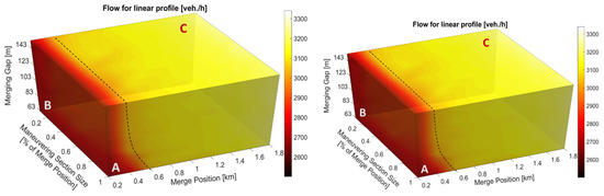 Figure 5 presents the obtained vehicle flow rate in the road as a function of merging position (xmerge), maneuvering section size (%dacc) and merging gap (gmerge) for linear (left) and sigmoid (right) gap profiles.