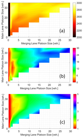 Higher flow rates are obtained for larger main lane platoons (Figure 7a), and higher merging successes are obtained for larger merging lane platoons (Figure 7b). The duration along the road section (Figure 7c) decreases with the ratio between main-to-merging lane platoon size.
