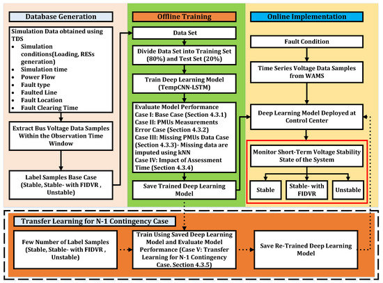 Figure 2 depicts the structure for implementing the deep learning-based method for STVS assessment. It consists of three stages: database generation, offline training, and online implementation. To represent the possible operating condition of the practical power system, different simulation conditions are run, and the data set is generated. The input are the post-disturbance bus voltage trajectories obtained for the particular operating condition obtained within the OTW. The output are the labeled samples generated with the bus voltage trajectories within the simulation period obtained using TDS. Here, the deep learning model (TempCNN-LSTM) is trained to map the input–output relationship between bus voltage trajectories and the corresponding STVS state of the power system subjected to disturbance. The overall process of the proposed method for the real-time STVS is shown in Figure 3. Finally, at the online implementation stage, the trained deep learning model at the control station predicts the STVS (stable, stable-with FIDVR phenomenon, and unstable) state based on the available samples of post-fault bus voltage trajectories from PMUs without the prior knowledge of which fault occurred in the power system. As a result, preventive measures can be implemented quickly while maintaining the system’s overall stability.