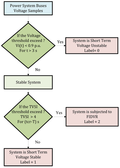 where at time t and are the post-fault and the pre-fault voltage magnitude of bus k, respectively. The threshold of permissible voltage deviation magnitude is [32], which is frequently employed in industrial criteria. Here, TVSI is used to evaluate the overall system’s voltage stability; a lower value indicates that the system is less susceptible to the FIDVR phenomena. Figure 4 shows a thorough illustration of the STVS phenomena and the labeling process for each sample. If all of the bus voltage trajectories are maintained at or above the pre-fault voltage for a settling time more than 3 s during the full simulation time, the samples are designated as stable [18,33,34]. On the other hand, samples are classified as unstable if the bus voltage trajectories fall below the pre-fault voltage magnitude. For example, if all the bus voltage trajectories of the power system are maintained above 0.9 p.u. at the settling time and over the simulation period, then the power system is in the STVS stable state. If all the bus voltage trajectories fall below 0.9 p.u. or a sustained low voltage without recovery over the simulation interval has occurred, then the power system is in the STVS unstable state. Furthermore, the STVS stable samples are classified into two labels, i.e, stable and stable-with FIDVR phenomenon. The system prone to FIDVR phenomenon is evaluated based on the TVSI. If the TVSI value is greater than 4 [32], it means that the power system is in the state of FIDVR phenomenon subjected to the disturbance. Then, the stable samples are labeled as stable-with FIDVR phenomenon. Similarly, all the samples at different operating scenarios are classified as unstable, stable, and stable-with FIDVR phenomenon, and we labeled each category as 0, 1 and 2, respectively. Overall, all of the samples are represented by their assigned labels, resulting in a multi-class classification problem for STVS evaluation.