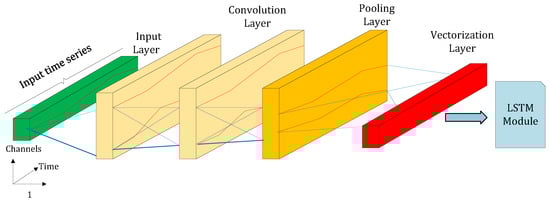 where H denotes the result of convolution on a time series V of length T, w denotes the weights of filter with length l, and g is the non-linear activation function. Here, rectified linear unit (ReLU) function is used for non-linear mapping, and the same convolutional filter value is used for each time stamp to extract the prominent features from the time series data. The pooling layer is used for down sampling the length of input time series data. After the convolution and pooling operation, the original time series is represented by the series of feature maps in a fully connected layer represented by the vectorization layer in Figure 6. Finally, the extracted features from the fully connected layers are input to the LSTM module in a time-distributed manner.
