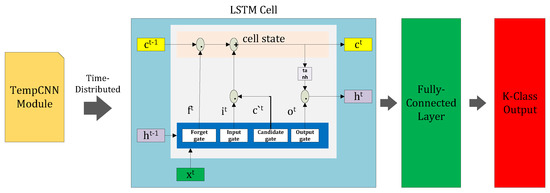An LSTM is adapted for processing the sequential input data. Unlike the recurrent neural network (RNN), LSTM can capture long-term dependencies in time series data with the help of an internal state memory cell [36]. This makes the network learn features of significance. The overall architecture of the LSTM module is shown in Figure 7, which consists of an input gate, forget gate, candidate gate and the output gate. The detail mechanism and operation of the LSTM block can be found in [16,37]. For time series data, an LSTM network may be created by constructing a sequence of many LSTM blocks. The high temporal correlation of the extracted features is handled by the LSTM module. The output vector from the preceding TempCNN module is the input to the LSTM module. In this scenario, the time-distributed technique is employed to reuse the same TempCNN module throughout all input slices. The LSTM layer is used to analyze the input time sequence, learning an implicit correlation between each temporal slice. Furthermore, the output layer has k neurons, corresponding to k class labels. The output layer, which consists of the SoftMax operation, is completely linked to the feature layer. It takes the input time series’ data of voltage trajectories and generates a probability distribution across the data set’s class label. Finally, to train and learn the parameters of the TempCNN-LSTM model, a feed-forward pass followed by backpropagation is applied to minimize the cost function. Here, for a multi-class classification problem, a categorical cross-entropy loss function is used. The Adaptive Moment Estimation (Adam) optimization algorithm [38] is used for training the data set and updating the weights parameters.