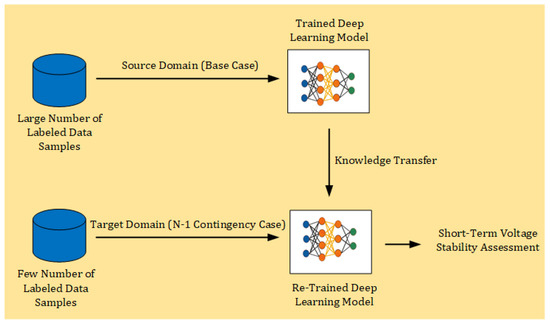 Conventionally, machine learning algorithms and deep learning algorithms for the assessment of voltage stability require the manual labeling of a large number of data samples, which is computationally expensive and time consuming [17,18,19,22,23]. When the network topology changes, most of the machine learning and deep learning algorithms fail in prediction, requiring frequent model updates with large data sets, which is time consuming and infeasible for online application [24,25]. Recently, many research studies have been conducted based on transfer learning (TL) where the same model trained to solve one particular task can be utilized to solve another but related task with few labeled samples [26,27,28,29]. However, none of the studies in the literature found so far have utilized the deep learning-based transfer learning concept for the assessment of STVS for the N-1 contingency cases using a single learning model. As a result, developing an STVS assessment approach that can acclimate to the new environment using a small set of labeled data sample is critical.