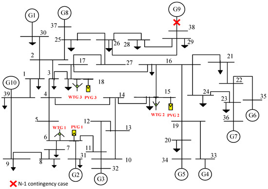 This study uses IEEE 9 Bus and New England 39 Bus test systems, as shown in Figure 9 and Figure 10, respectively, for the STVS assessment. The IEEE 9 Bus test system consists of three generators, three loads, six lines, and three transformers. The detailed parameters of this test system can be found in [39]. The New England 39 Bus test system consists of 10 generators, 19 loads, 34 lines, and 12 transformers. The detailed parameters of this test system can be found in [40]. The nations that are leading the way in renewable energy typically have a penetration rate of 20–30% [41]. For this reason, the RESs considered in this study are PVG and WTG, which are assumed to supply 25% of the total electrical demand of the test system. The data and model for RESs are taken from [42,43]. For the IEEE 9 Bus test system, each solar and wind farm of 39 MVA are connected to bus 8. Similarly, for the New England 39 Bus test system, the size of the solar and wind farm at bus 6, 15 and 18 are 297, 263, and 202 MVA, respectively. This study uses the built-in wind farm model and PVG model available in DIgSILENT power factory software [44]. TDS in DIgSILENT power factory software were used to create the data set. To examine the performance of various deep learning and machine learning models, the Keras module with TensorFlow backend in Python is utilized. All the calculations are completed on a PC with an AMD Ryzen 5 2600 Six-Core processor running at 3.40 GHz and 16 GB of RAM.