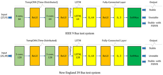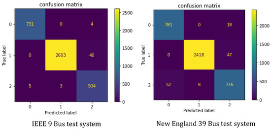 The proposed TempCNN-LSTM is used in this case study to categorize all the phenomena that are present in the STVS assessment. The performance of the proposed model is then compared with other deep learning and conventional machine learning models for both the test systems. According to the data generation by TDS, the training data set for the IEEE 9 Bus test system, there are 19,450 labeled samples: 3514 unstable as class 0, 13,401 stable as class 1, and 2535 stable-with FIDVR as class 2. Similarly, for the training data set for the New England 39 Bus test system, there are 20,500 labeled samples: 4062 unstable as class 0, 12,207 stable as class 1, and 4231 stable-with FIDVR as class 2. All the analysis in this case is conducted with the assessment time of 0.25 s. For the IEEE 9 Bus system, the TempCNN-LSTM model consists of two convolution layers each with 64 units. The TempCNN-LSTM model for New England 39 Bus, on the other hand, is made up of two convolution layers, each with 128 units. For both systems, the filter length of each convolutional layer is set to 3. The learned features are flattened into one long vector after the convolution step. It then passes through an LSTM layer in a time-distributed manner. The LSTM model consists of a single layer with 64 and 128 hidden units for the IEEE 9 Bus system and New England 39 Bus system, respectively, one dense layer and an output layer classify the STVS state of the system. In each layer of both systems’ models, the ReLU activation function is used for non-linear mapping. The SoftMax activation in the output layer gives the probability distribution of each class label, and the class with the highest probability is selected for the particular input samples. The overall model configurations for both test systems are shown in Figure 11. The parameter setting for training the proposed TempCNN-LSTM model is shown in Table 4. The units in the convolutional layers, filter size, hidden units in the LSTM layer, and dense layer are determined using hyper-parameter optimization using the grid search technique using five-fold cross-validation. Table 5 shows the performance of the proposed TempCNN-LSTM model for the prediction of the STVS state of the system in terms of average accuracy, precision, recall, F1-score, training time and testing time. The results show that the proposed model can predict the STVS state with the average accuracy of 98.66% and 96.95% for the IEEE 9 Bus system and New England 39 Bus system, respectively, for a multi-class classification problem. The diagonal of the confusion matrix of the test results, as shown in Figure 12, includes the correctly classified samples of each label for both test systems. In this study, the performance of the proposed model is compared with other popular deep learning and machine learning models such as TempCNN, LSTM, SVM and DT. The result in Table 5 shows that the proposed model outperformed significantly for the multi-class classification task required for the assessment of STVS. Apart from classification accuracy, the proposed model outperformed other models with precision of 98.74%, recall of 98.66%, and F1-score of 98.68% for the IEEE 9 Bus test system with an uneven class distribution of test samples of each category. Similarly, for the New England 39 Bus test system, the proposed model gives a better result with precision of 97.01%, recall of 96.95%, and F1-score 96.97% compared to other classifiers. The results show that the performances of TempCNN and LSTM classifiers are comparable with the proposed model having a marginal difference of accuracy of less than 1%, while the SVM and DT classifiers performed poorly with accuracy less than 93%. The results show that the DT classifier requires less computational time for both the training and testing data set compared to other classifiers for both the test systems under study. Even though the training time required for the proposed model is high, the data processing time for the test samples is quick enough to meet the criterion for online application.
