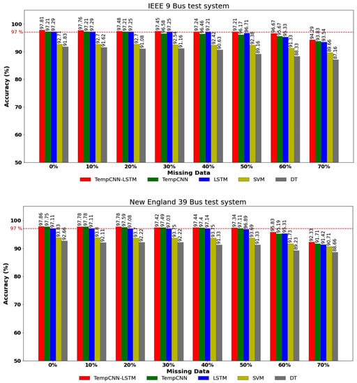 Most of the deep learning and machine learning models fail in prediction when subjected to missing PMUs data, since they require a complete set of features input [48,49]. In a practical power system, the PMUs data become unavailable due to PMUs failure or due to communication latency [50]. In this case, the robustness of different classification models to missing PMUs data is analyzed for online application. To simulate the missing PMUs data for online STVS assessment, a certain portion of the test data set within an OTW is randomly set to NaN (not a number values). Furthermore, the missing bus voltage measurements from PMUs are imputed using k nearest neighbor (kNN) algorithms [47]. Finally, the test set with newly imputed values are used for prediction of the STVS state of the power system using pre-trained models. The STVS state is predicted using 10%, 20%, 30%, 40%, 50%, 60% and 70% of missing data in the test set. The result in Figure 13 shows that there is less influence in the prediction capability of these models with missing PMUs data. The proposed model is more tolerant of missing PMUs data, even when 50% of the data are missing, with an accuracy of more than 97% for both test systems. With merely imputed values using kNN, the missing data condition appears to have a lower impact on the overall classifier performance. Evidently, TempCNN and the LSTM classifier still provide the better accuracy up to 50% of missing data with a marginal difference, while the SVM and DT classifiers’ prediction accuracy is significantly low compared to the proposed model for both the test systems.