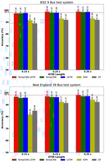 In this scenario, the performance of the proposed model is evaluated under different assessment times. The input data set is generated for different OTW lengths (0.15 s, 0.25 s and 0.35 s). Then, the performance of the proposed model is compared with other deep learning-based time series classification models (TempCNN and LSTM) and machine learning models (SVM and DT). The result of both the test systems in Figure 14 demonstrate that as the OTW duration is increased, all the models’ performance accuracy improves, with TempCNN-LSTM having greater accuracy than the TempCNN, LSTM, SVM and DT models. Increased assessment time results in more accurate STVS evaluations but less time for remedial response and vice versa. Therefore, there is always a trade-off between the assessment time and model performance accuracy. However, for an online application, a reliable assessment time would be with acceptable accuracy. Specifically, if the acceptable accuracy is assumed to be more than 98%, then for the IEEE 9 Bus system, the proposed model can deliver the STVS status within the OTW of 0.25 s. However, for the New England 39 Bus system, the proposed model can deliver the STVS status reliably only for the OTW of 0.35 s. Similarly, TempCNN and LSTM can provide STVS assessment only for the IEEE 9 Bus system with an OTW of 0.35 s, while for the New England 39 Bus test system, it requires an OTW greater than 0.35 s.