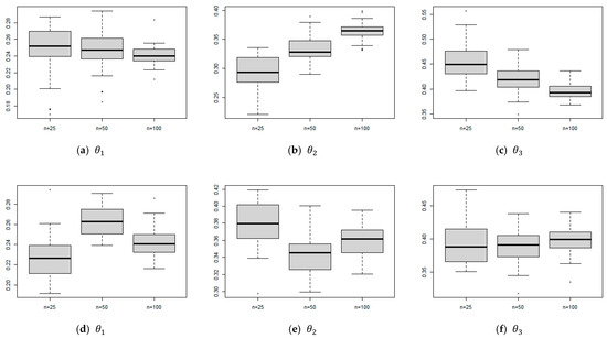 The summaries presented in the above table competently indicate the legitimacy of the proposed model in retaining the predefined underlying ordering of the competing objects, that is, , when ties in the discrete choice data are permitted. Additionally, it is noteworthy that the proposition competently captures the degree of indecisiveness precipitated in the comparative information. This fact is realized regardless of the varying sample sizes and different values of the tie parameter. However, a more profound performance of the approach under discussion is witnessed with an increased sample size. For example, the closest and most precise estimation of both delicacies, that is, the worth parameters and tie parameter, are witnessed for the case of , where the proposed scheme closely estimates the values of both the worth parameters and tie parameter. Moreover, the decreased width of the credible interval shows the precision of the procedure with which it remains capable of estimating the preset experimental states. This realization is further highlighted in Figure 2 depicting the prevalent variability in the Bayes estimates through side-by-side box plots. One may notice that minimal variation is attributed with a larger sample size.