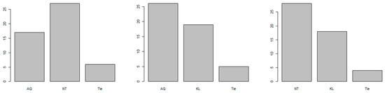 We now proceed by demonstrating the applicability of the devised model by studying the choice data of three drinking water brands commonly available in market. The pairwise comparative data with permitted ties were collected from fifty local residents of Islamabad, Pakistan, by inquiring about their preferred brand among (i)—Aquafina (AQ), (ii)—Nestle (NL) and (iii)—Kinley (KN). One may notice that in this situation and . Table 6 displays the collected data, whereas Figure 3 depicts the distribution of counts in the relevant predefined classifications.