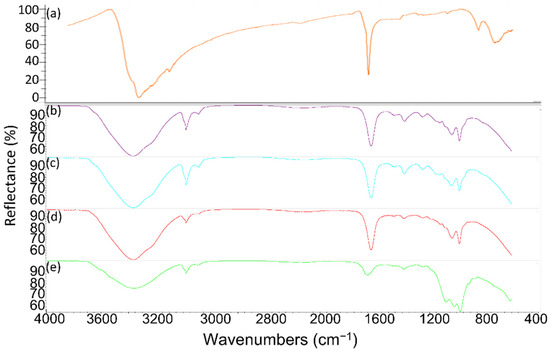 FTIR spectra of the PCMs: (a) reference MnCl2, (b) specimen 1, (c) specimen 2, (d) specimen 3, and (e) specimen 4.