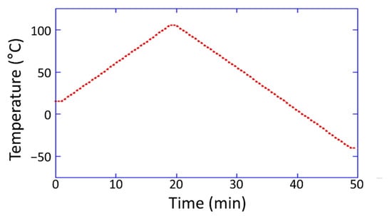 In this study, DSC measurements were conducted with a DSC Q 200 from TA Instruments (New Castle, DE, USA) with a temperature accuracy of 0.1 °C and an enthalpy precision of 0.1% [37,38]. The samples with weights between 6 and 7 mg were sealed in aluminum pans and lids, and were measured in a chamber purged with nitrogen. The temperature profile for DSC temperature is given in Figure 2.