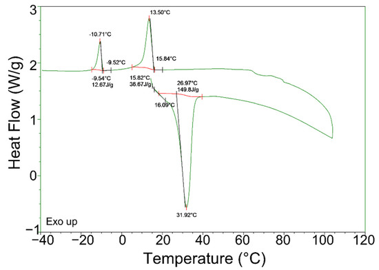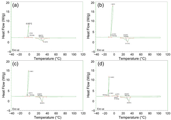 During the exothermic process, treated specimen 2 showed two exothermic peaks of onset temperatures of 15.8 and −9.5 °C, solidification temperatures of 13.5 and −10.7 °C, and latent heats of 36.6 and 12.6 J/g. The supercooling was mitigated via homogenization, but not fully prevented. The exothermic peak temperatures of treated specimen 2 were very similar to those of specimen 4, which had a melting temperature distinguishable from the room temperature.