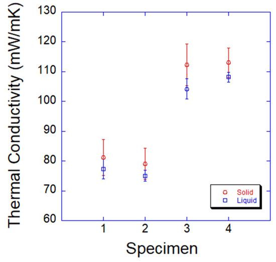 Figure 5 shows the thermal conductivities of specimens 1 to 4. Specimens 1 to 4 under solid phases had thermal conductivities of 81, 79, 112, and 113 mW/mK, respectively. The specimens under liquid phases had thermal conductivities of 77, 75, 104, and 108 mW/mK, respectively. As shown in Figure 5, the thermal conductivities of the PCMs in the solid state were higher than those in the liquid state. This phenomenon occurs because of the effect of the microstructure changing from an orderly solid structure in the solid state to a disorderly liquid structure in the liquid state [57].