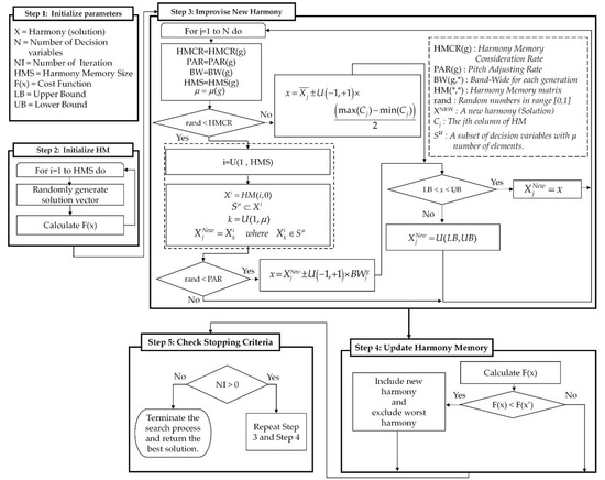 Traditional optimization algorithms, such as linear programming (LP), non-linear programming (NLP), and dynamic programming (DP), have taken on major roles in solving optimization problems. Nevertheless, their drawbacks generate a demand for other types of algorithms, such as meta-heuristic/heuristic optimization approaches. These algorithms have been identified as efficient, intelligent techniques to solve optimization issues. In recent years, various metaheuristic algorithms (MAs) have been proposed to solve a wide range of complex real-world problems [26,27,28]. The harmony search (HS) algorithm is a type of metaheuristic optimization algorithm, that was designed by Geem et al. [25]. Inspired by the improvisation of music players, they first play music randomly with existing instruments. This harmony is kept in the musician’s memory. In the next stage, according to the harmony in their memory, the musician plays new music that has changed from the previous one. Generally, the HS algorithm consists of three steps: (a) harmony memory initialization; (b) improvisation; and (c) updating the harmony memory. The harmony memory initialization step produces the initial harmonies (solutions), randomly. Then, in step (b), an iterative process is completed to enhance the quality of solutions, by making new solutions according to three operators, including harmony memory consideration, pitch adjustment, and random consideration. Finally, in step (c), the best-found harmony is selected based on objective function(s) as the optimum solution.