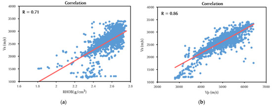 Representation of the correlation between inputs: (a) RHOB with R = 0.71 and (b) VP with R = 0.86 and target VS.