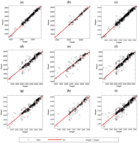Introduced by Alexey G. Ivakhnenko [37], the GMDH-type neural network is a self-organized method that combines both self-organizing and multilayer neural network benefits to fit the data [38]. The GMDH tries to automatically identify the best model for structuring the network and to integrate inductive techniques, biological neuron techniques, probability, and black-box concepts [39]. Therefore, according to the GMDH, a model is a set of neurons made by pairs based on the quadratic polynomial combination of inputs or previous layers’ outputs. The main goal of this method is to find function f to estimate in a feed-forward network according to a set of N inputs X = {x1, x2,…, xN} and one output Y, based on a quadratic polynomial transfer function. The Volterra series is a non-linear transfer function used in GMDH neural networks, shown in Equation (7). In this equation, the regression method is used to calculate the coefficients ai for pairs of input variables (xi, xj) [39]. As an example, a two-variable second-degree polynomial, derived from the Volterra series, is presented in Equation (8):