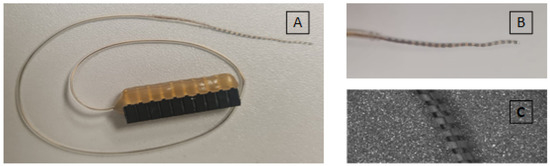 The electrode array is Oticon Medical’s Evo with 20 platinum–iridium electrodes. The EA has an active length of 24 mm. As shown in Figure 1A, electrodes are individually wired and connected to the 20-pin header socket. Electrodes are evenly spaced but their size reduces from basal to apical electrode, as shown in Figure 1B,C.