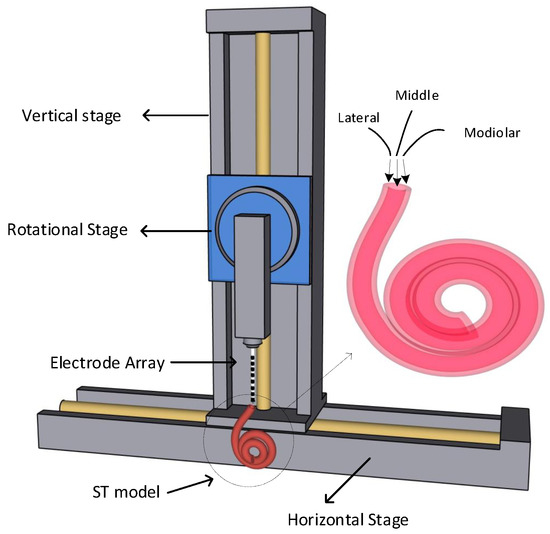 Three-DoF actuation system for electrode array insertion in ST model. Graphical representation of insertion from three different directions are in the inset.