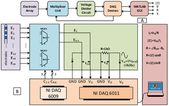 (A) Impedance measurement setup configuration chain, (B) detailed block/circuit diagram for the complex impedance measurement system. The diagram is colour-coded according to the sections of the system.