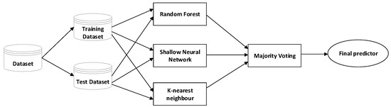 Although a reasonable accuracy has been achieved by our individual model, the ensemble approach has been used to increase the classification accuracy for both our classifiers. According to [42], ensemble learning is the method in which multiple classifiers are combined to take their weighted vote to make predictions on new data. Each classifier makes its prediction and then votes for the final prediction, as shown in Figure 5. This figure explains one of the ensemble learning processes that is called majority voting ensemble. In this kind of scheme, the final predictor would be the predictor that receives the majority vote from the multiple classifiers. In our setup, we have three classifiers (RF, SNN, and KNN) that achieved the maximum accuracy. Although it is possible to give uneven weights to the individual classifier vote, equal weight is given to each classifier in our system.